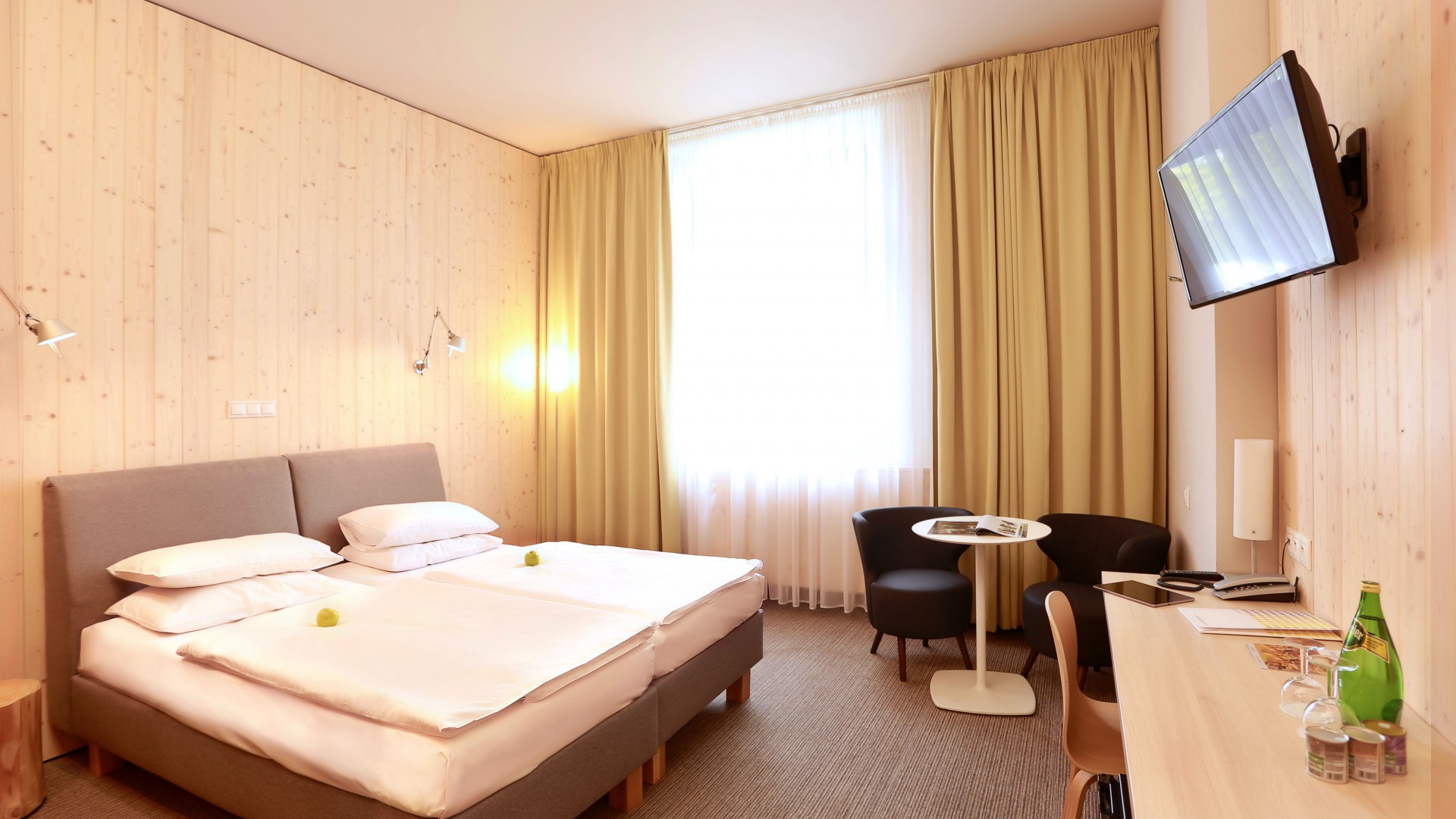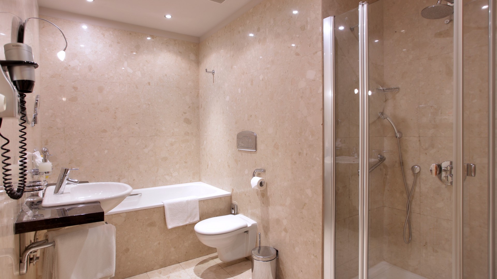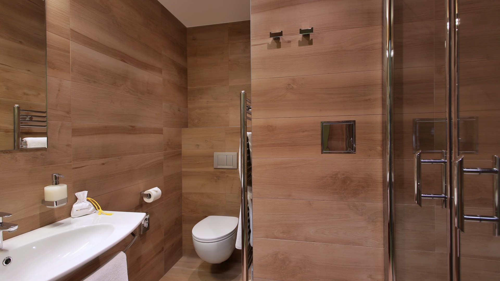 20-25m2, dvoulůžková manželská postel nebo s oddelenými lůžky, designová koupelna s toaletou, podlahové vytápění, klimatizace, koupelnová kosmetika, vysoušeč vlasů, sprchový kout nebo vana, pracovní stůl, minibar, trezor, satelitní TV, telefon s přímou volbou, WI-FI internetové připojení.